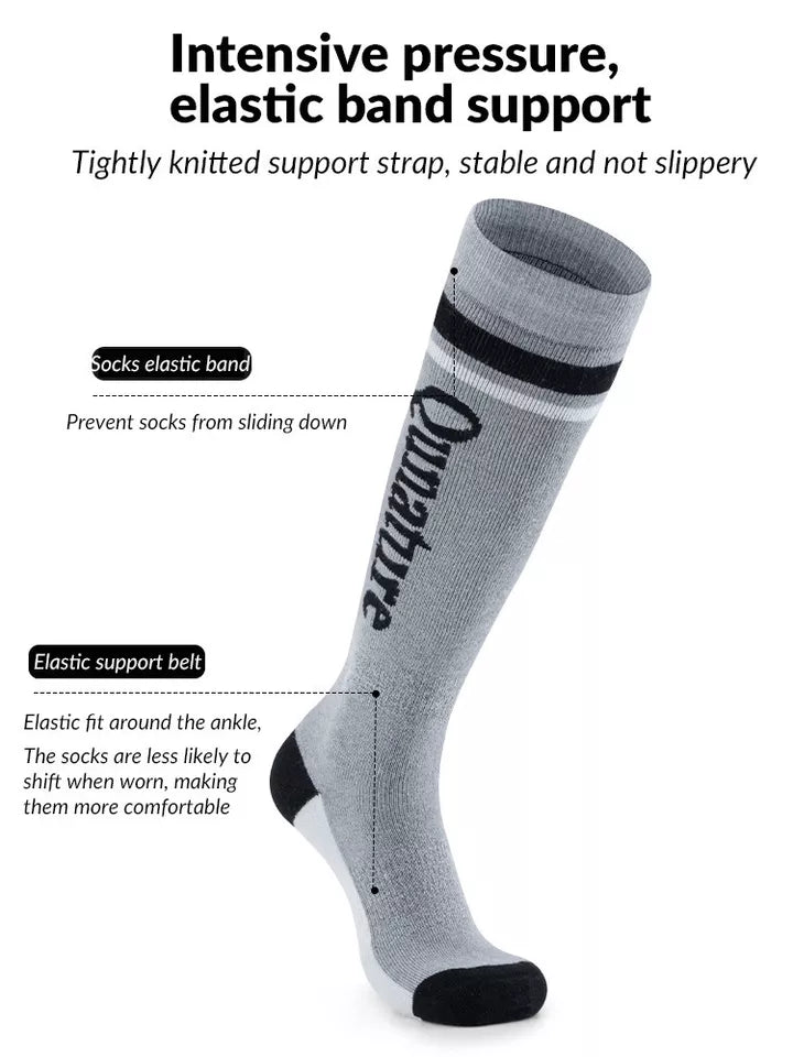 Comfortabele pasvorm: De structuur van het sokontwerp past zich aan de kromming van de enkel aan, wat zorgt voor een uitstekend draagcomfort. Dankzij de verdikte handdoekbasis aan de onderkant van onze skisokken om vocht af te voeren, blijven je voeten droog en zweetvrij, waardoor je comfortabel blijft tijdens je ski-avonturen.
